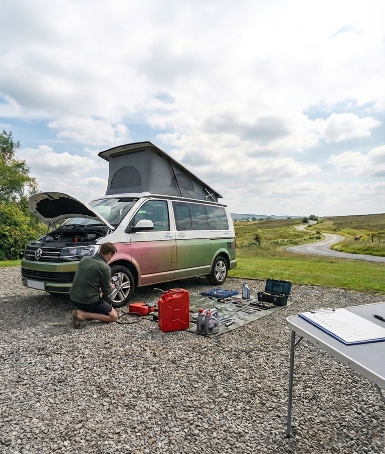Bevor es losgeht, sollte der VW Van auf Herz und Nieren geprüft werden. Dazu gehört eine gründliche Inspektion von Motor, Reifen, Bremsen und Elektronik. Stelle sicher, dass alle notwendigen Werkzeuge und Ersatzteile an Bord sind. Auch das Überprüfen der Flüssigkeitsstände und das Mitführen eines Ersatzkanisters sind wichtig, um unterwegs keine bösen Überraschungen zu erleben.